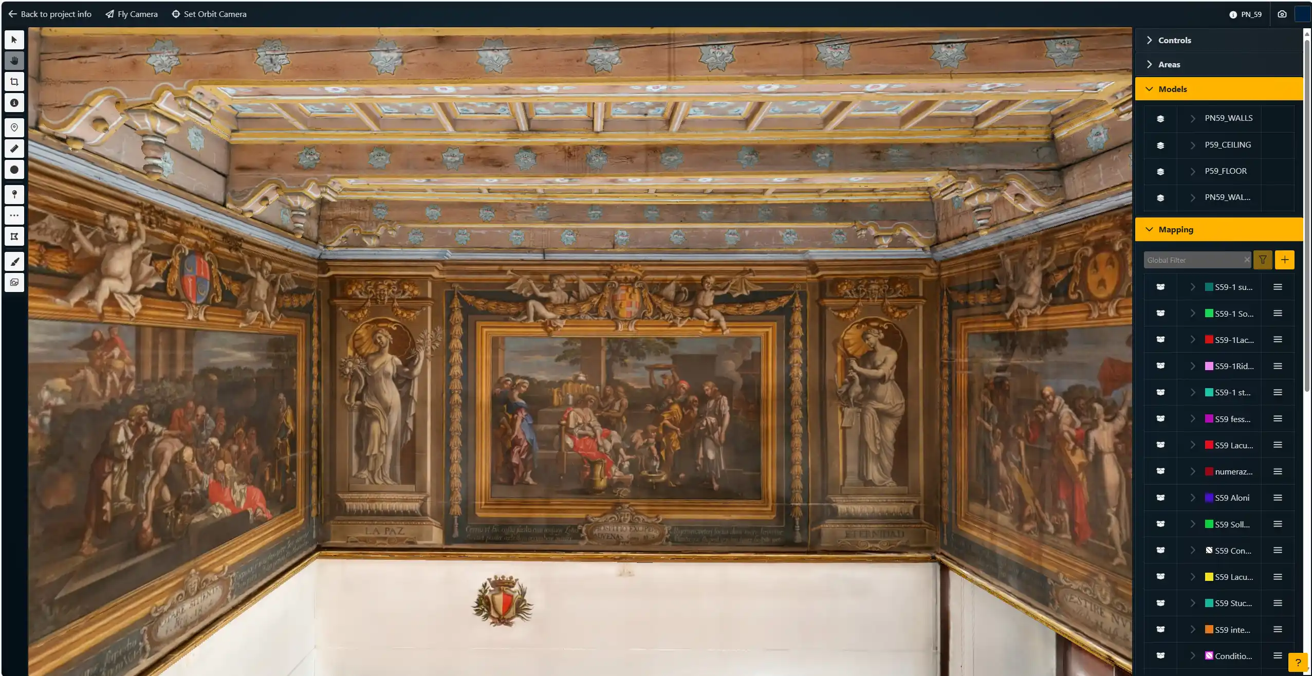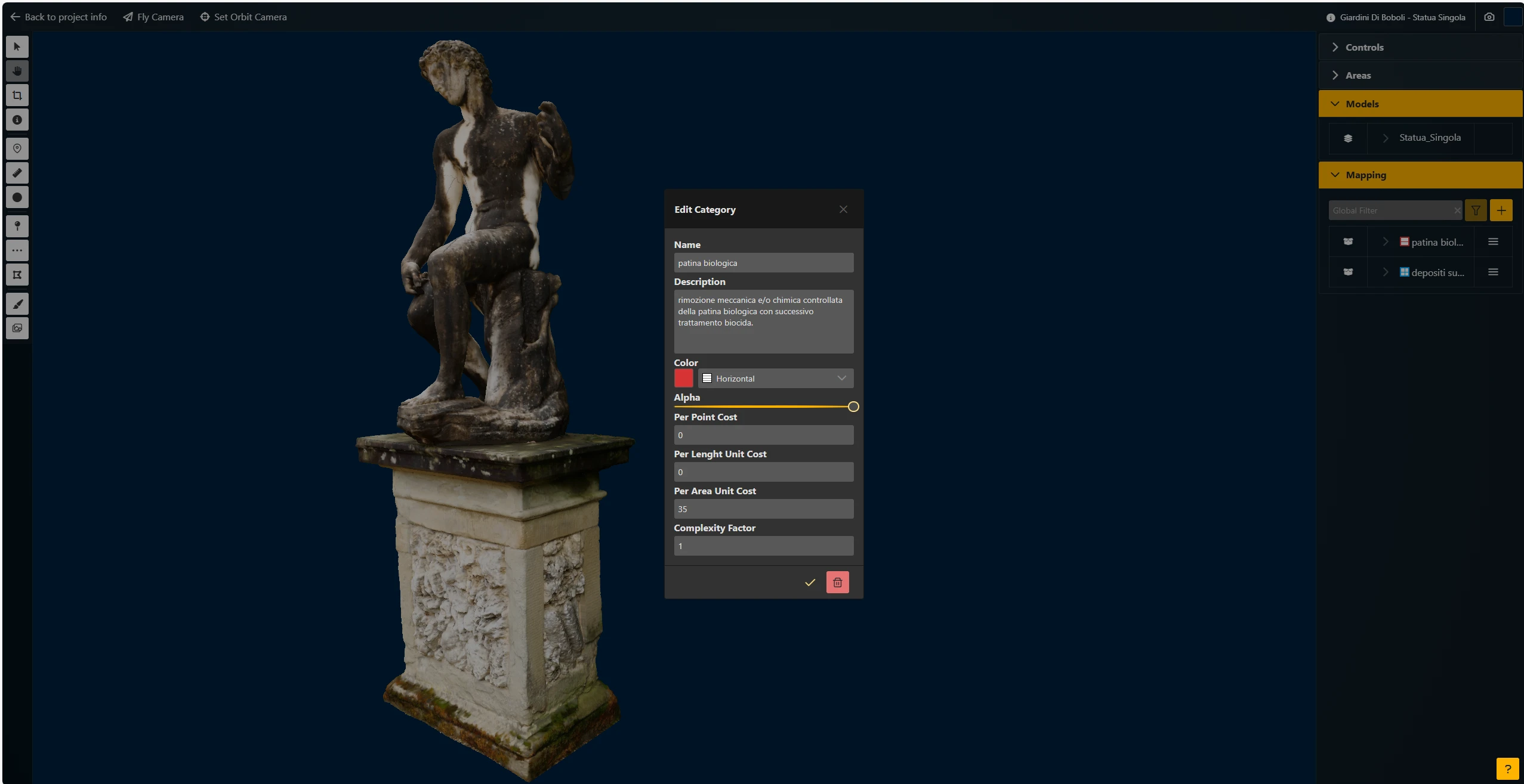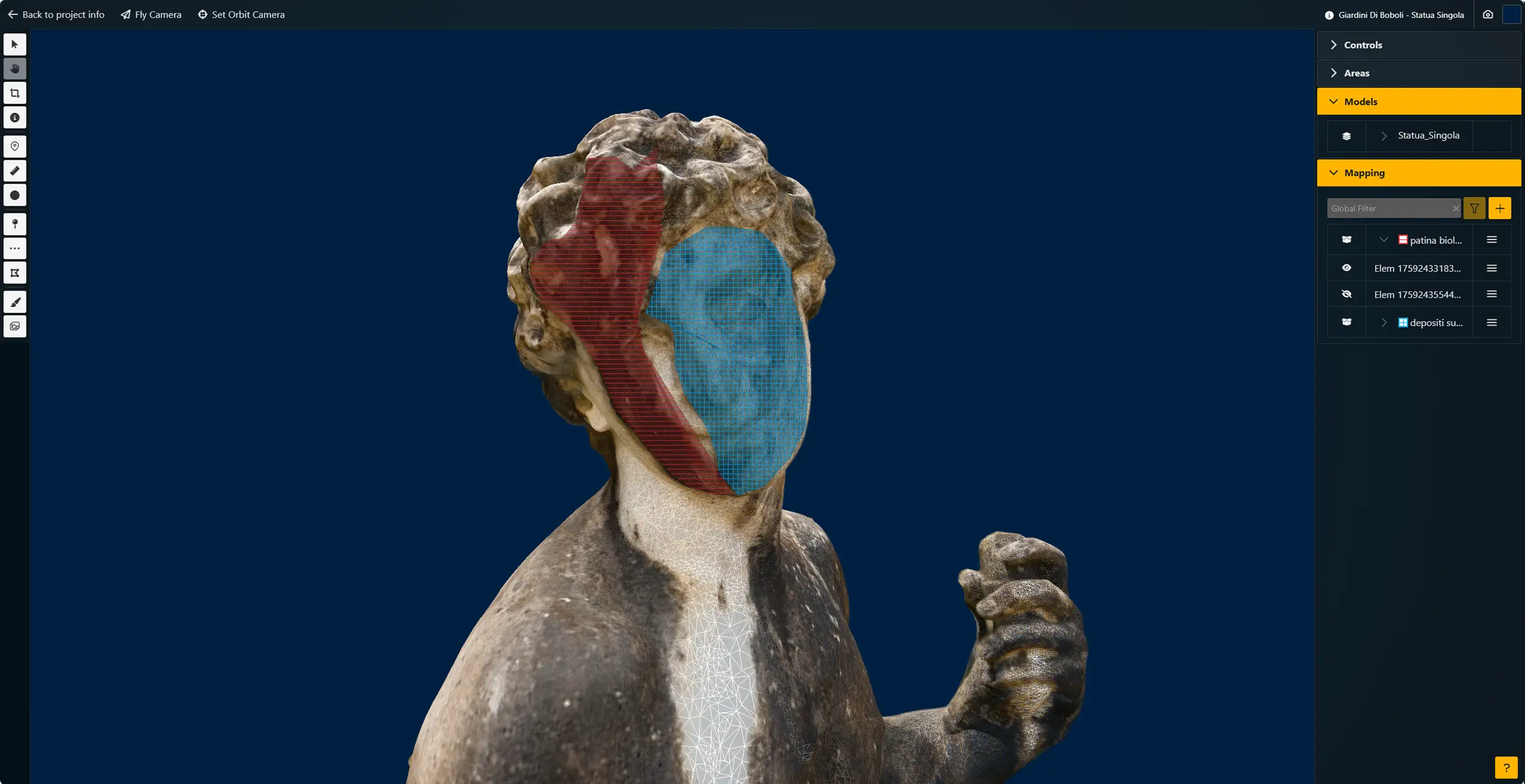 Phronesi mette a disposizione dei professionisti una suite completa di strumenti dedicati all’analisi e alla gestione dei beni culturali. Tra questi, i tool di misurazione e 3D mapping permettono di operare direttamente sul gemello digitale dell’opera con la massima precisione e immediatezza. Grazie alle funzioni di selezione puntuale, lineare e di superficie, è possibile mappare in tre dimensioni ogni forma di degrado e documentarla in maniera accurata sull’oggetto virtuale. Le aree individuate possono essere organizzate in categorie personalizzabili e arricchite di informazioni utili alla valutazione e alla pianificazione degli interventi. I vantaggi per i professionisti sono molteplici: le misurazioni risultano precise e affidabili, l’organizzazione dei dati diventa chiara e strutturata, i costi di ripristino vengono calcolati in modo automatico con computi metrici generati in formati standard come Excel o CSV, mentre documenti, immagini e video possono essere collegati direttamente al modello digitale. In questo modo Phronesi non si limita a essere un semplice visualizzatore 3D, ma si configura come un ambiente di lavoro digitale completo, capace di semplificare le attività di restauro, manutenzione e documentazione, trasformando l’analisi in uno strumento operativo concreto e immediatamente utile.